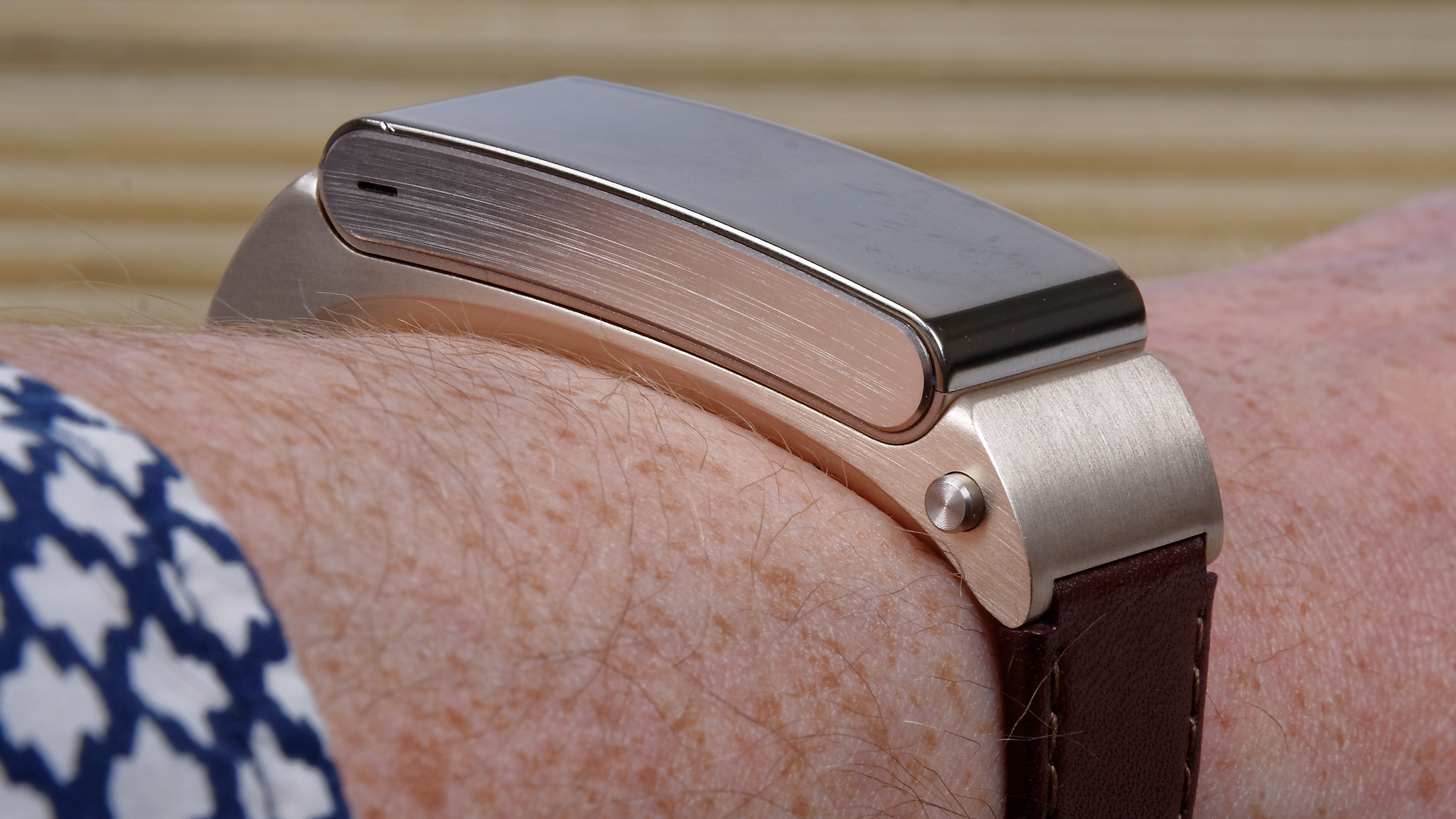 It’s slim and light like a fitness tracker, can survive a fitness-related sweat-soaking, and its design is right out of the lifestyle device playbook. It’s available in black, silver and gold, the latter with a rather natty brown leather strap, and its tiny, 0.73in monochrome passive matrix OLED (PMOLED) touchscreen shines through what looks like a polished metal surface.