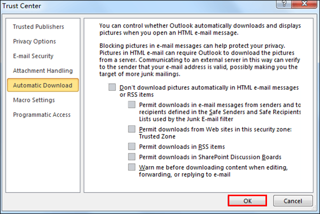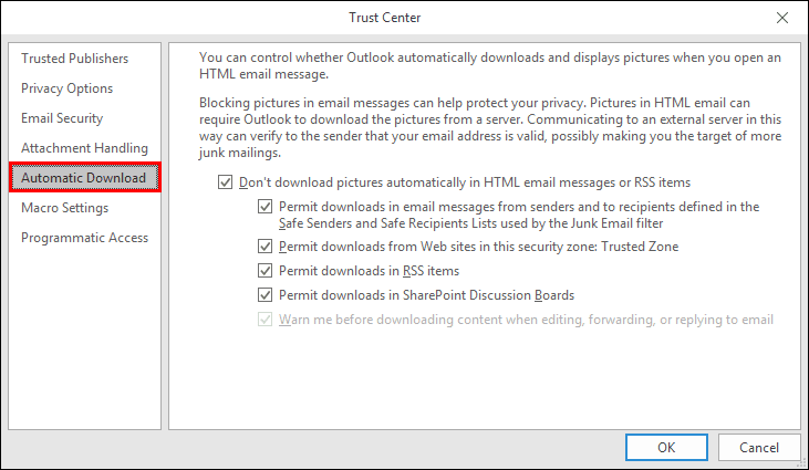 - Select File and then “Options.” Then click on “Trust Center” and go to “Trust Center Settings.” On the left, click on “Automatic Download.”