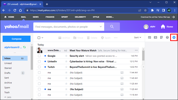 - Yahoo “Inbox”and select “Settings” in the upper-right corner.