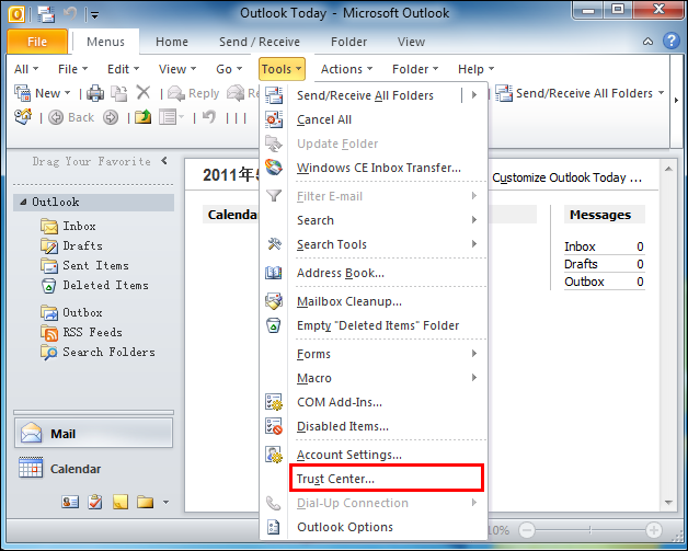 - Open Outlook 2007 and go to “Tools.” In the drop down-menu, select “Trust Center.”