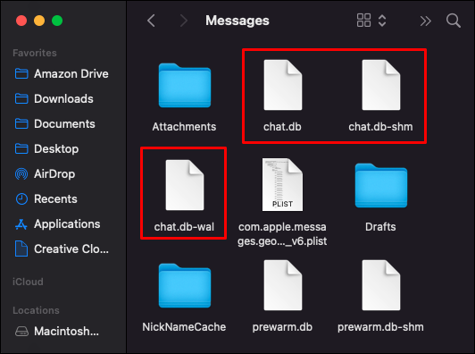 - Remove “chat.db-wal,”“chat.db,” and “chat.db-shm” folders.