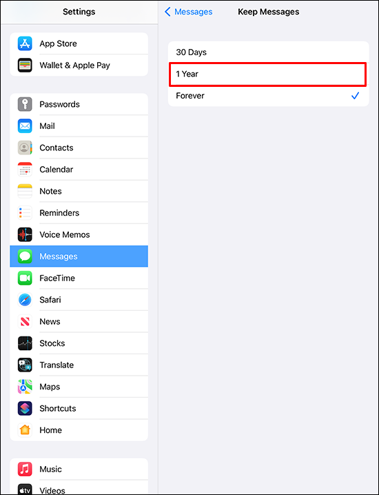 The default option is forever, but you can choose to delete messages older than a month or a year ago.