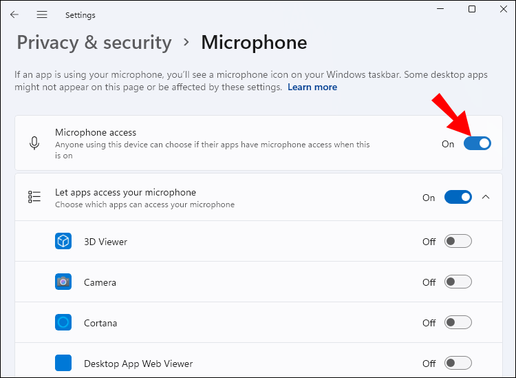 - Next to “Microphone access,” move the toggle switch from “Off” to “On.”
