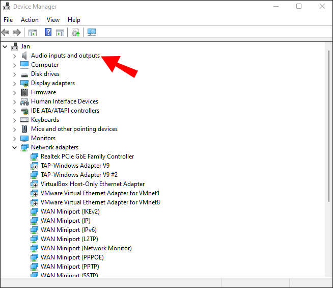 - Launch the “Device Manager” and expand the “Audio inputs and outputs” section.