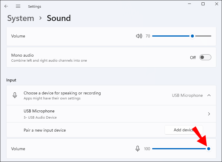 If the input volume slider is under 20%, that’s probably the reason others can’t hear you on a call. Ideally, the microphone volume should be above 85%.