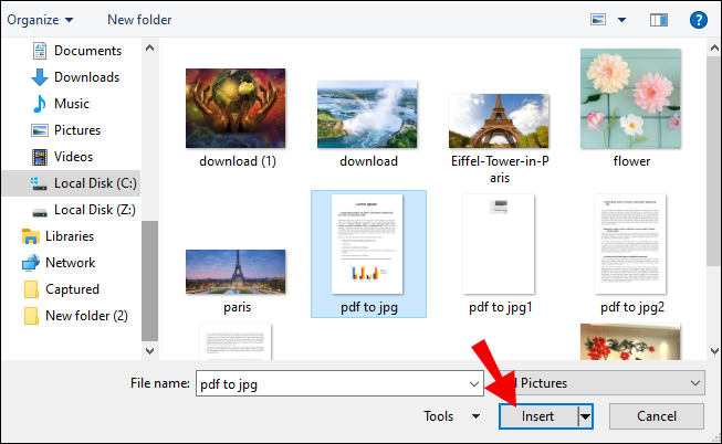 Before inserting the image, you need to convert the PDF into JPG format. This will allow you to insert it as an image. Bear in mind that when you convert the PDF, each page will become its own image file.