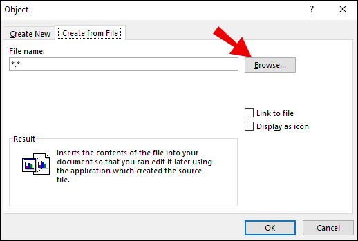 - You’ll now see the “Object” window, select the “Create from File” tab, and then the “Browse” option.
