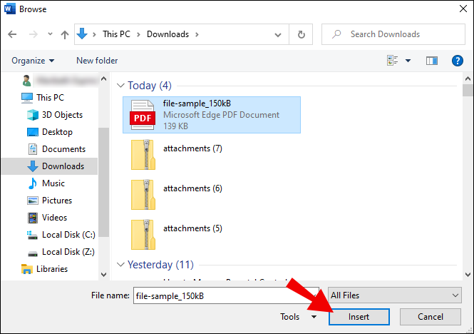 - Select “Insert” to embed the PDF file into Word.