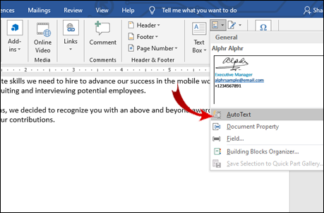 If you need to include additional information in the signature, you can use the Quick Parts feature. Here’s how to do it: