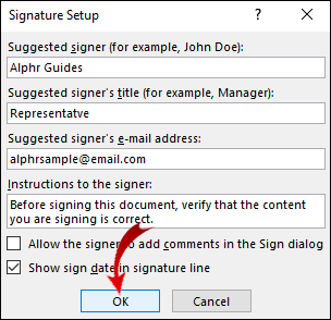 - A small pop-up window will appear. Write the name, title, and e-mail address (optional) of the signer in the appropriate boxes.