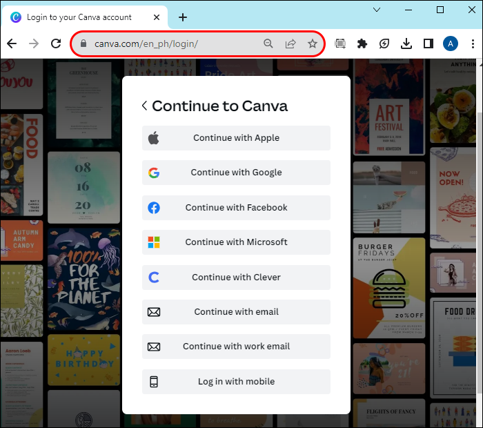 - Launch your browser and log in to your Canva account. If you don’t have an account, create one for free.