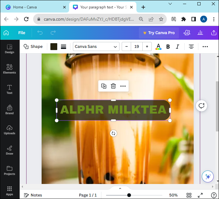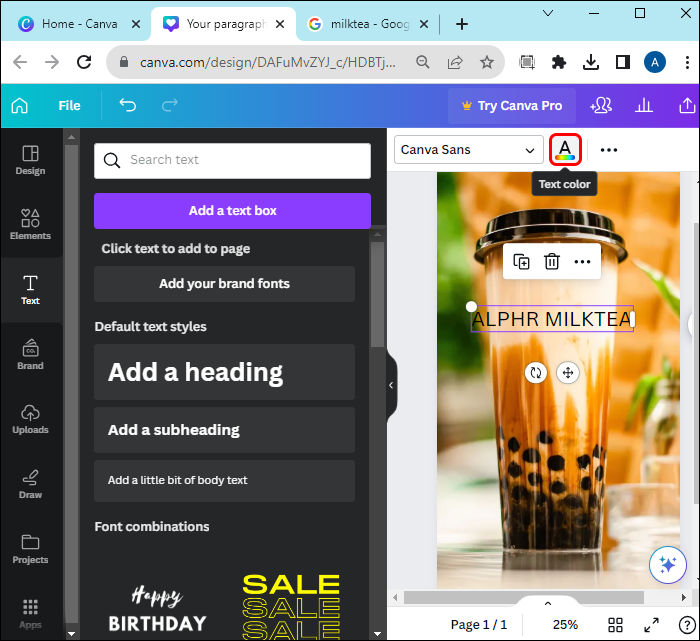 - When your design loads, go to the sidebar tools and tap “Text.” Hit the “Add a text box” button.