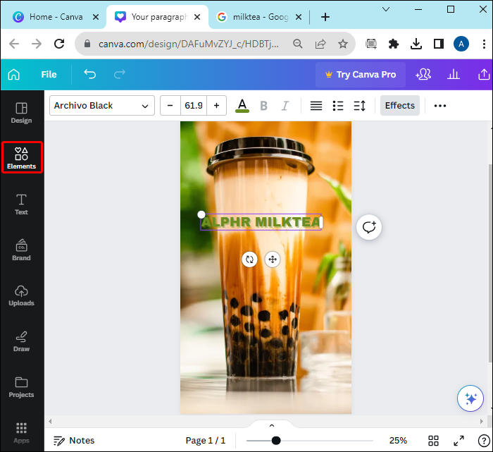 - Navigate to the side toolbar and tap “Elements.” Type the shape you want in the search bar and select it when it appears in the search results.