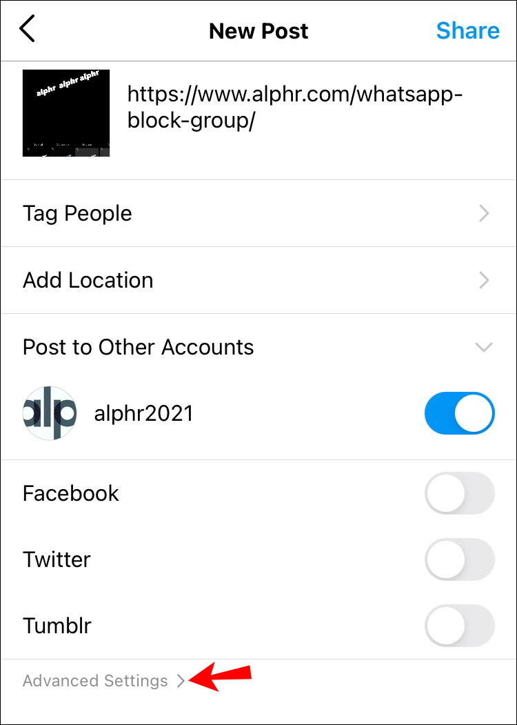 - Add a post as you usually do. When you’re about to share the post, scroll to “Advanced Settings” on the “Share Screen” page.