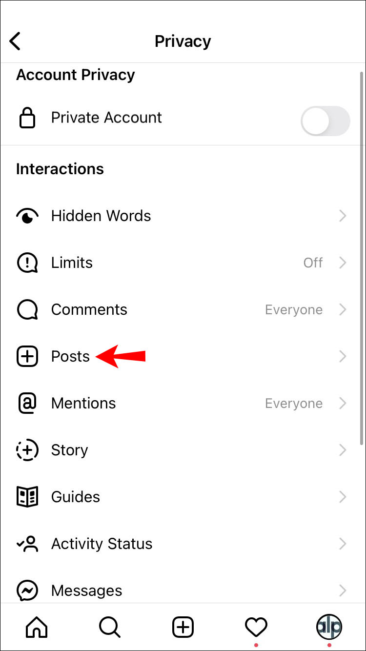 - Navigate to “Settings,” then “Privacy,” then “Posts.”