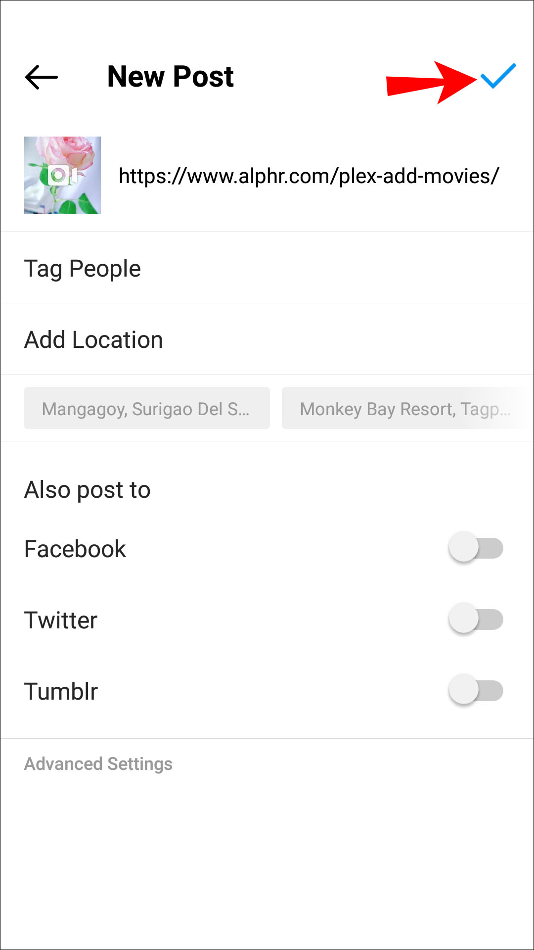- Create a post as you usually would, but don’t send it just yet. Instead, scroll down to the “Advanced Settings.”