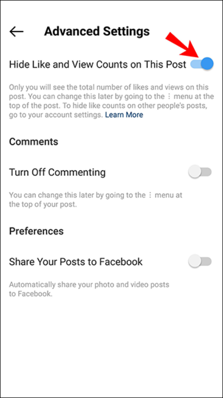 - Then toggle the “Hide Like and View Counts on This Post.”