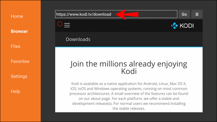 5. Access Downloader and either enter the URL of the Kodi official website or look for it in the built-in browser.