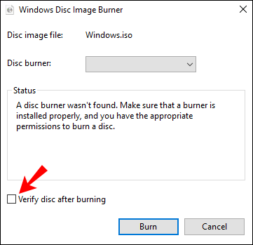 - A pop-up window will appear. Check the little box at the bottom of the panel that says “Verify Disc After Burning.”