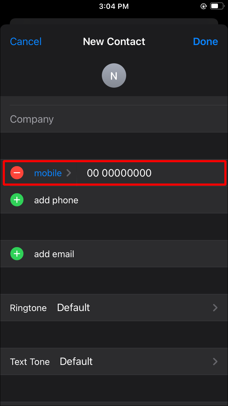 - Then, key in “000-000-0000” for the phone number of the new contact.