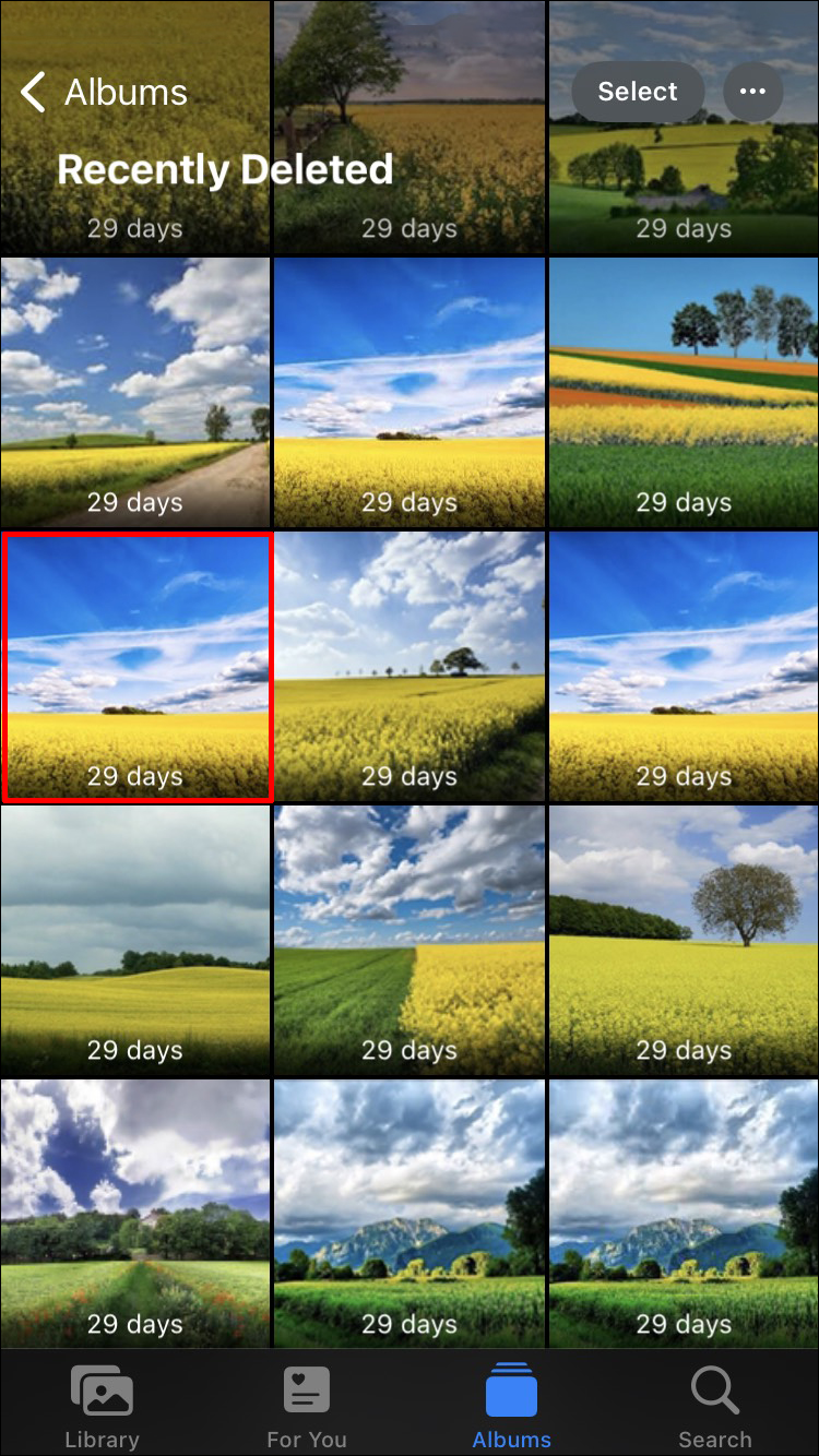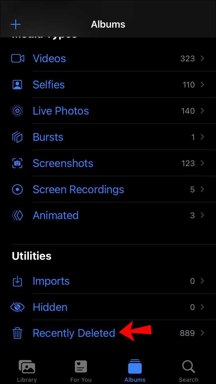 - Scroll to the bottom until you find the “Recently Deleted” album, then select it.