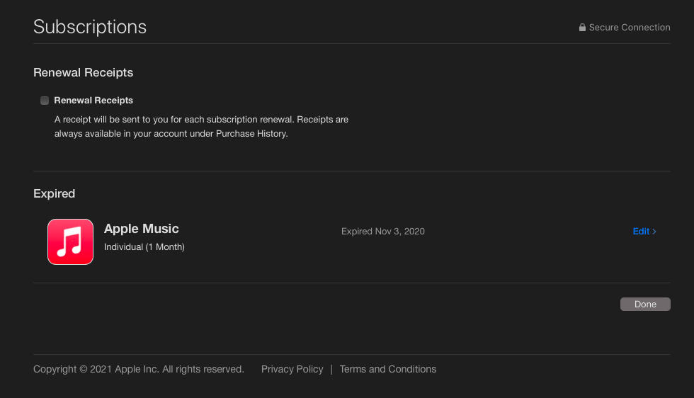 Verify your Apple ID password and then, from the Account Information screen, look in the Settings section for the Subscription entry. Click Manage and you’ll see the same list of Active and Expired subscriptions described above.