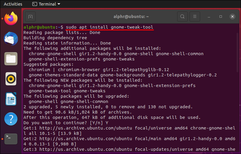 - Open a Terminal window, type “sudo apt install gnome-tweak-tool,” then press “Enter.” Type in your password when prompted.