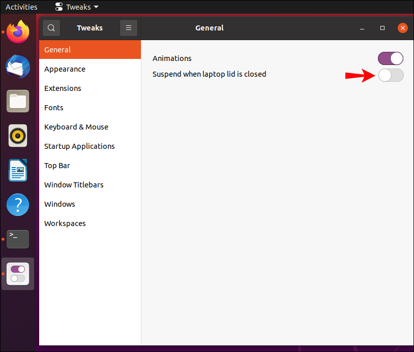 If you want to keep your laptop on or awake when you close the cover in Ubuntu, you can do it in two different ways. The easiest way is to install an app called Tweaks.
