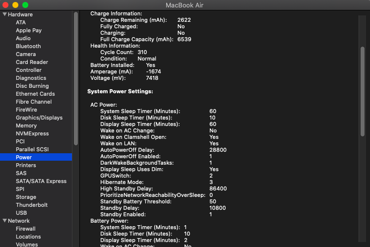 If you’re using a MacBook, you can easily see if there’s a problem with the battery by holding the “control” button and clicking the “Apple logo” in the upper left-hand corner. Choose “System Information.” A new window opens. Click on “Power.” Check to see the status of your battery. The battery is listed as “normal” under the “Condition” section in the screenshot below.