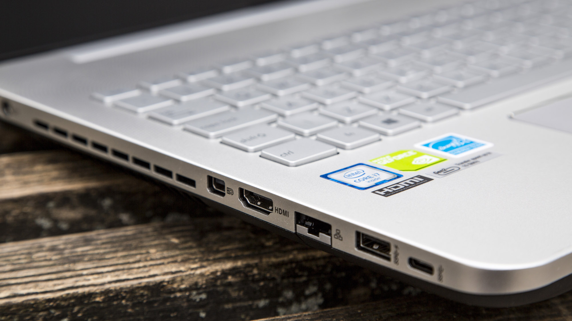 The sheer size of the laptop means there’s plenty of room for ports and sockets. For data, you get three USB 3 and one USB 3.1 Type-C port. There’s also both a full-size HDMI output and mini-DisplayPort for hooking up external displays. The aforementioned DVD-RW drive is on the right side and there’s also room for an SD card reader and Gigabit Ethernet. Wireless, meanwhile, is covered by 802.11ac Wi-Fi and Bluetooth 4.0.[gallery:5]