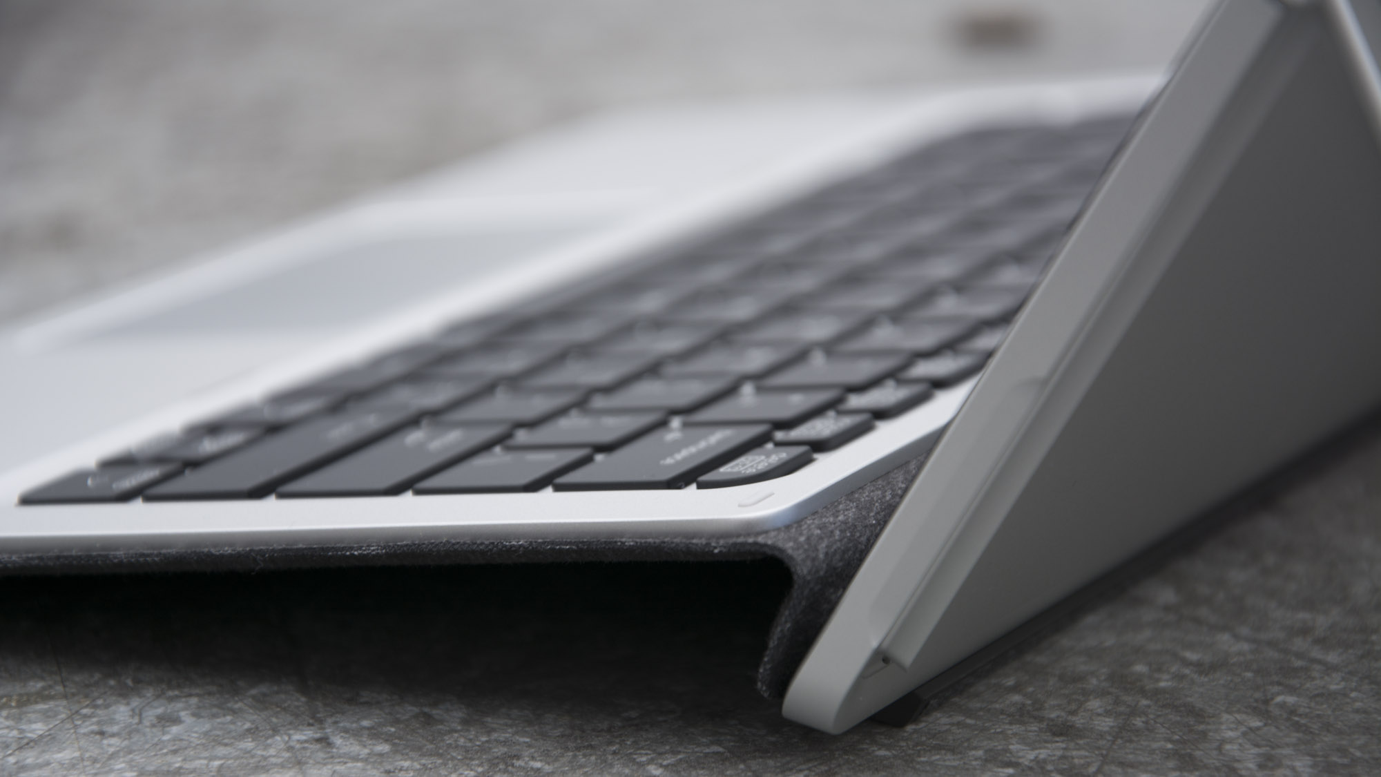 HP’s detachable Travel Keyboard is also similar in many ways to Microsoft’s Type Cover. It clamps to the bottom spine of the tablet firmly, and has a pleat along its top edge so you can prop it up at an angle when you’re typing. And it’s at least as good to type on as the Surface Pro 4, if not more so.