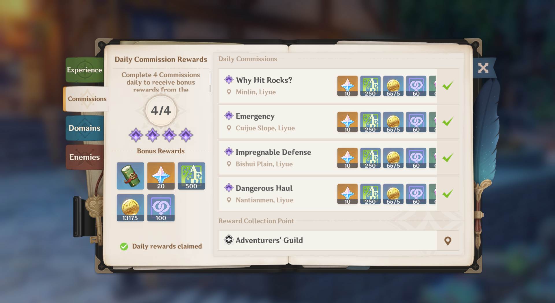 The Daily Commissions reset at 4 A.M. according to the server’s time. Not only will you get some Companionship EXP from them, but there are plenty of other rewards such as Mora and Primogems.