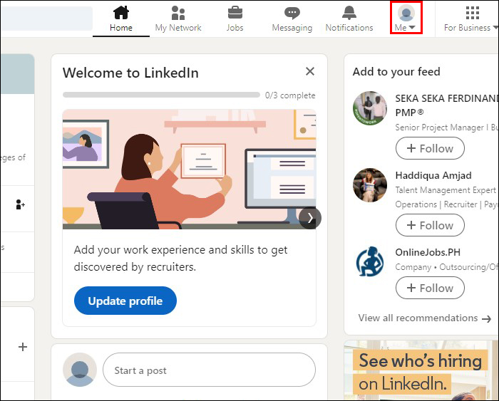 - Click the “Me” icon at the top of the LinkedIn homepage.