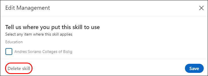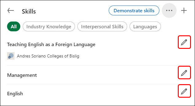 - Find the skill you want to remove and click the “Edit” pencil next to it.