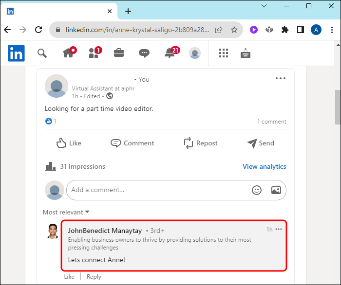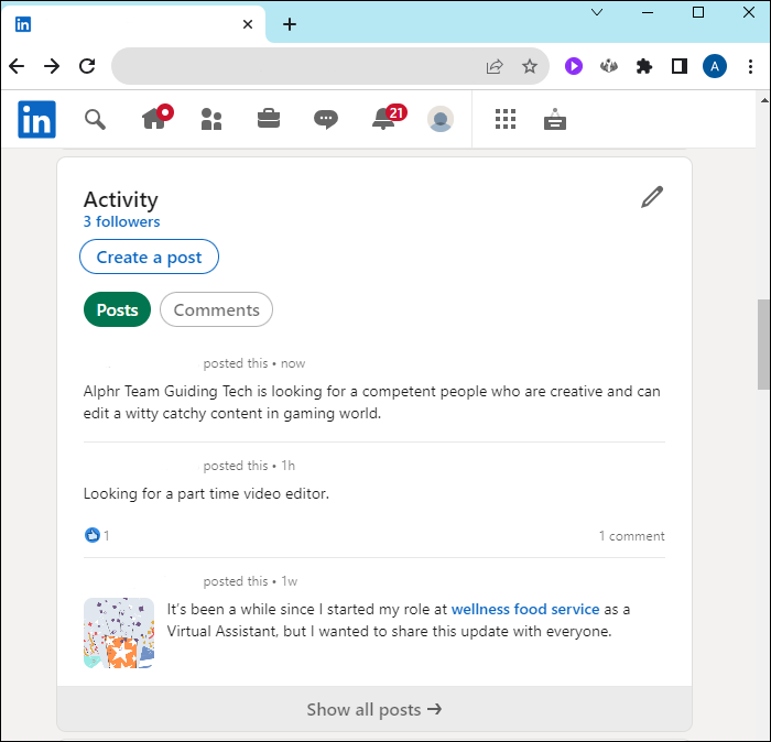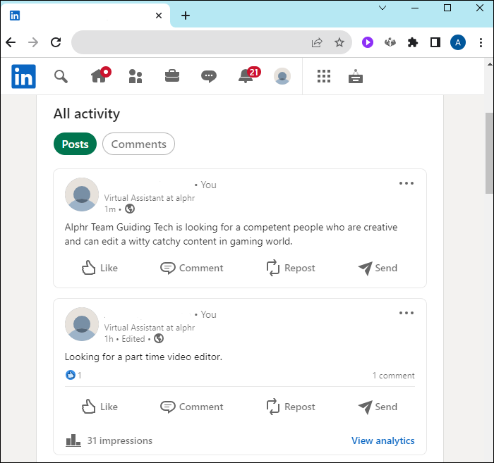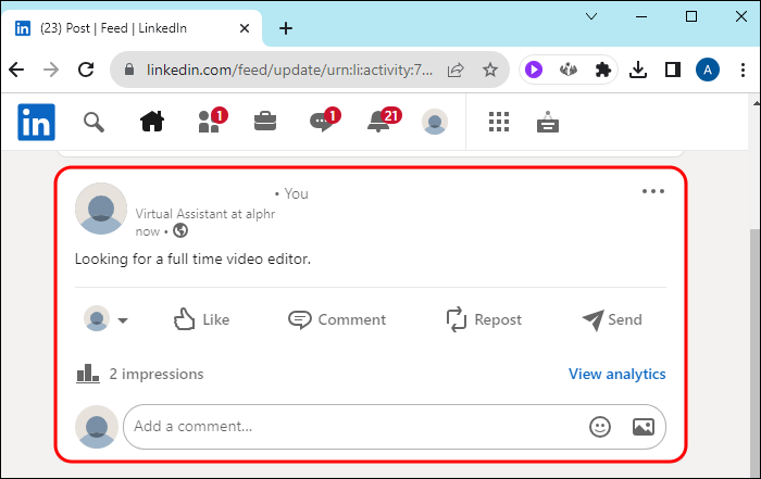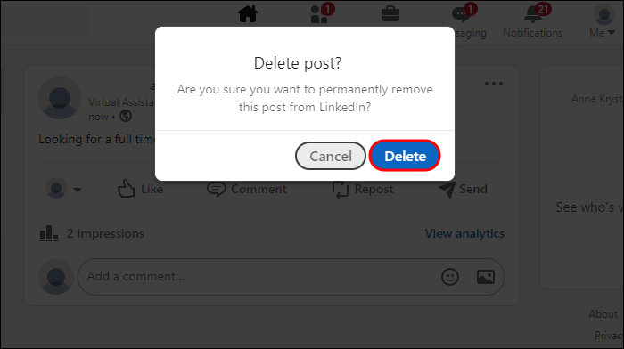 Since LinkedIn is used for business networking, it’s common for users to post that they’re either hiring or looking to be hired. Once this is no longer the case, it’s important to update your profile by deleting the outdated post.