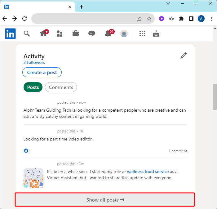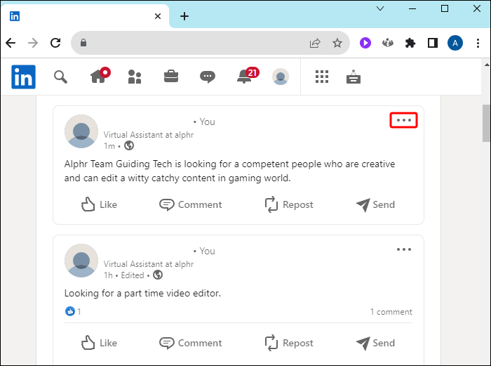 - On your LinkedIn profile, locate the post you want to remove.