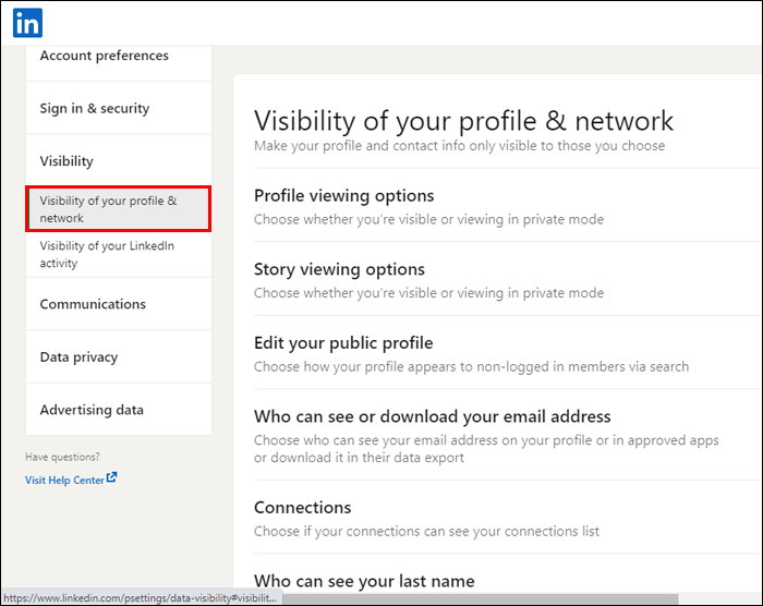 - Proceed to Visibility of your profile & network right under the Visibility tab.