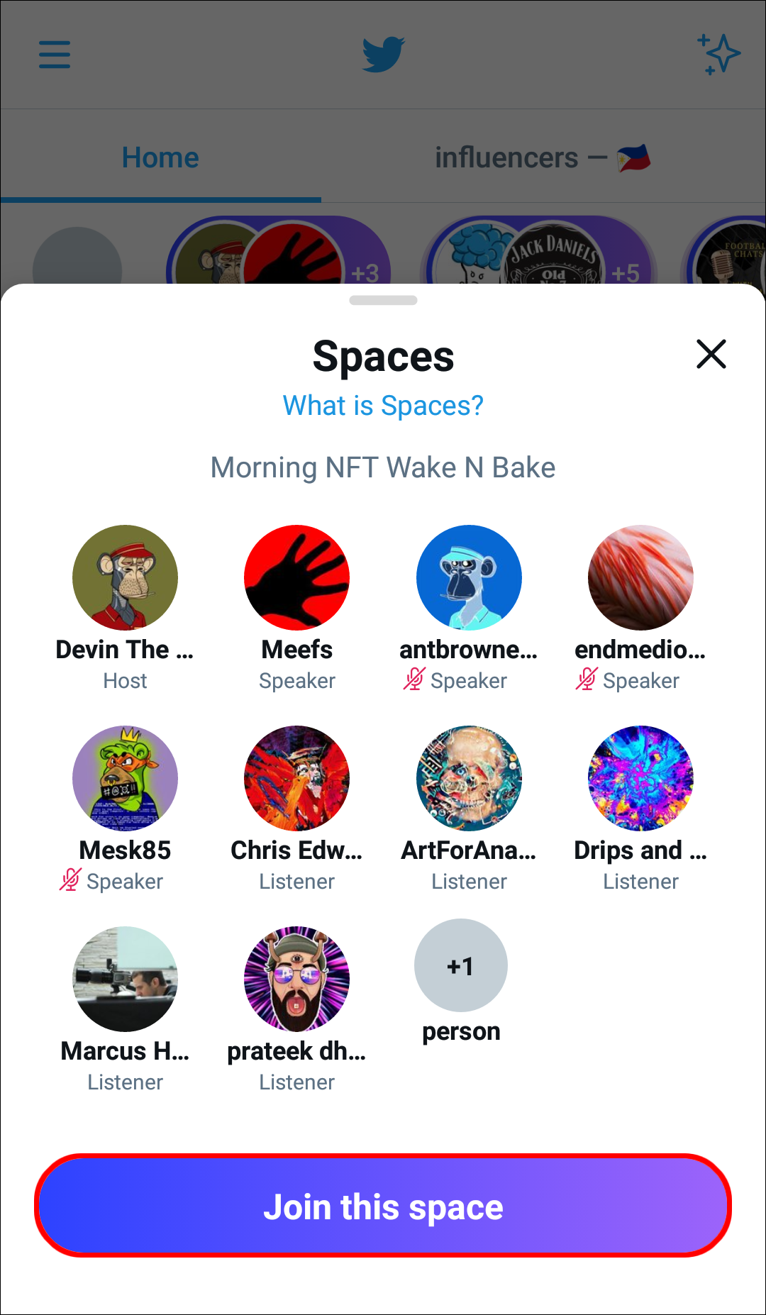 - Click on the “Start Listening” button on the Tweet. You’ll be able to see the other members of that Space and their status (host, listener, or speaker).