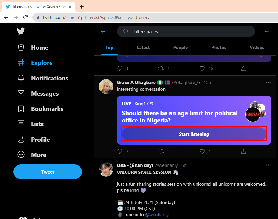 To listen to a Twitter Space on the Twitter web/desktop app, follow the steps below: