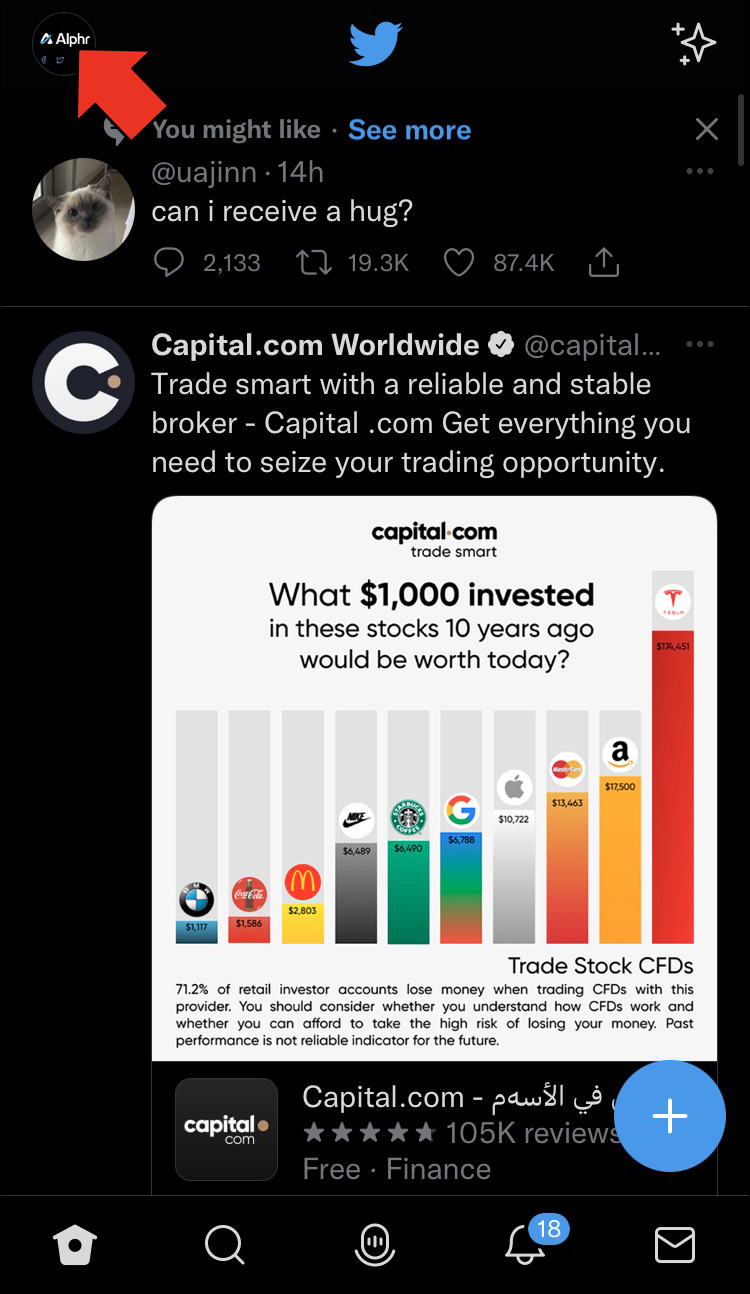 - From your Twitter homepage, tap the three-dot icon next to your profile photo in the bottom-left corner.