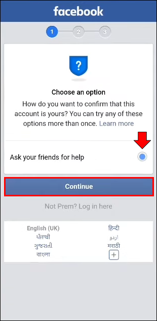- Select the “Ask your friends for help” option and then hit “Continue.” A new page will open with a list of five of your friends randomly selected by Facebook.