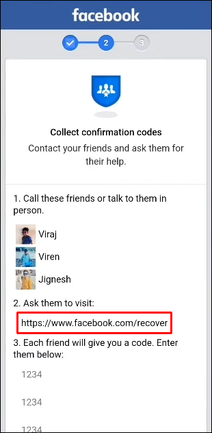 - At this point, you need to contact three of the five friends listed and request them to visit “facebook.com/recover” using a browser of their choice. Once on that page, ask them to click on “Help [Your Name]” and then follow the on-screen prompts to receive the 4-digit code you need to access your account.