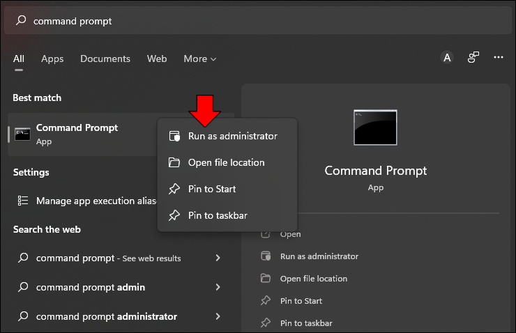 - Enter a search for the “Command Prompt” app, and right-click it.
