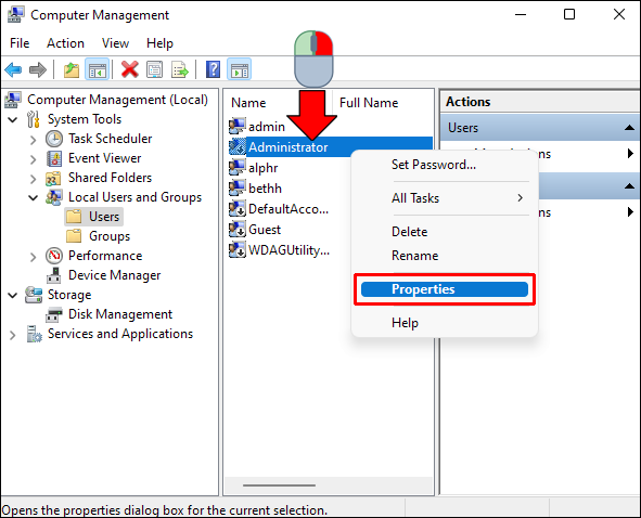 - Right-click the “Administrator” account on the right, and choose “Properties.”