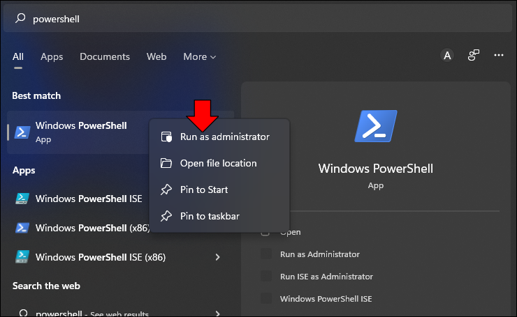 - Enter a search for “PowerShell” and right-click the PowerShell result.