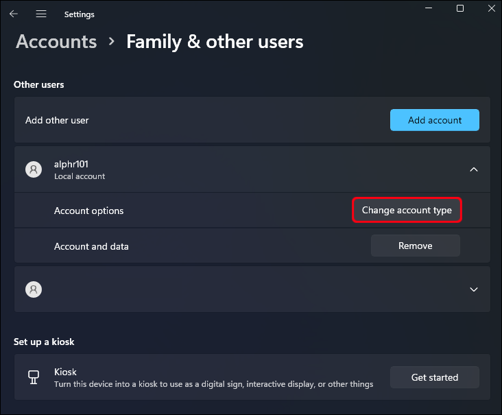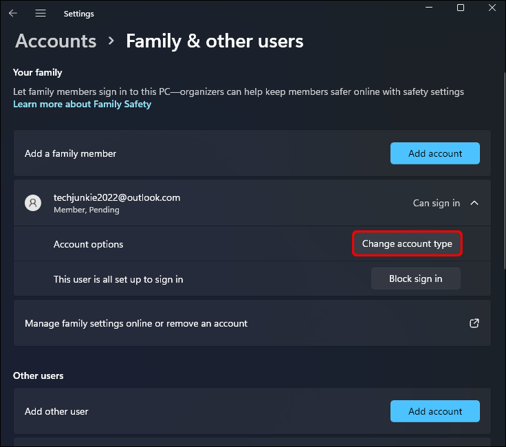 - Access the “Family & other users” page again and choose the new account from “Accounts settings.”