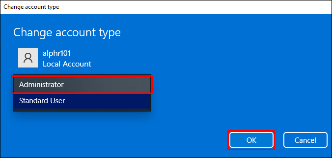 - Beneath “Account type,” click “Administrator,” then “OK.”