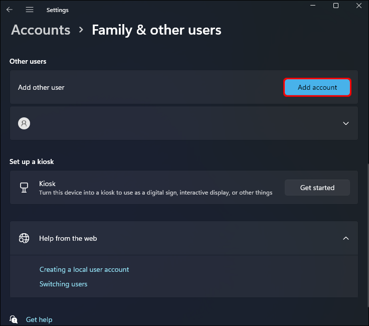 - From the “Family & other users” page, beside “Add a family member,” click the “Add account” button.
