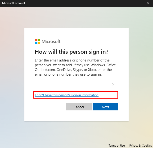 - You’ll be asked to type in the email address. Select the “I don’t have this person’s sign-in information” link.