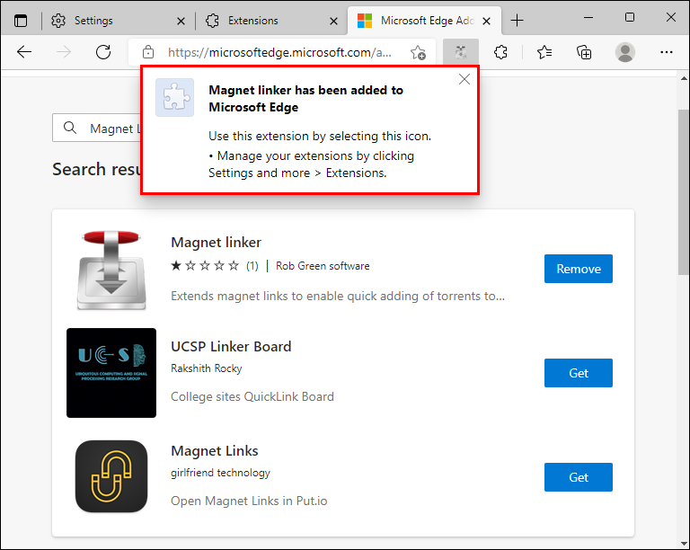 To enable your magnet link to open in Edge, you will use a very similar process to opening a magnet link in Chrome. There is, however, no need to set up handlers. Instead, you will need to download the “Magnet Linker” extension for Microsoft Edge.